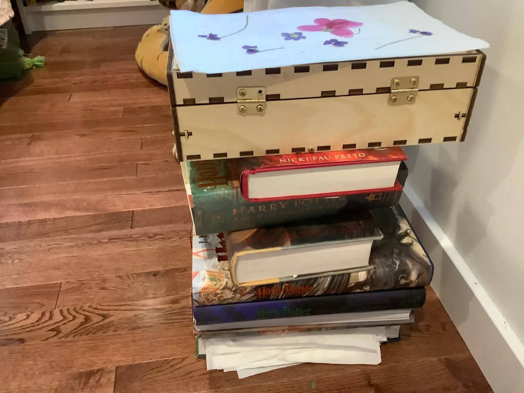 Once you have your things to press, take a heavy, thick book that is not important to you, (you can use multiple) and open up to the very last pages. Then, grab two tissues and place the first one on the page that you’ve opened up to. Once you’ve done that, you can take your flowers and leaves that you’ve decided to press and arrange them on the tissue in the way that you would like them to be dried. FUN FACT! Once they are pressed, most leaves and flowers are as thin, or thinner than paper! Here is how I laid my flowers out. The way you lay them out is how they are going to look once they’re finished pressing.