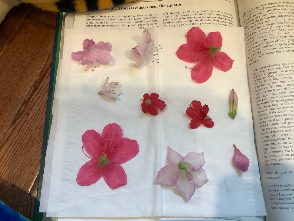 The time in the day you pick your leaves and flowers is important. Make sure when you take your leaves/flowers, they are dry. Like after the sun has evaporated the morning dew, but before the evening rain shower. Also the leaves or flowers you take, should be relatively thin and not super thick. It’s OK if the flowers or leaves are thin and they’re in a 3-D shape, but the big, thick. Leaves and flowers just do not press well.