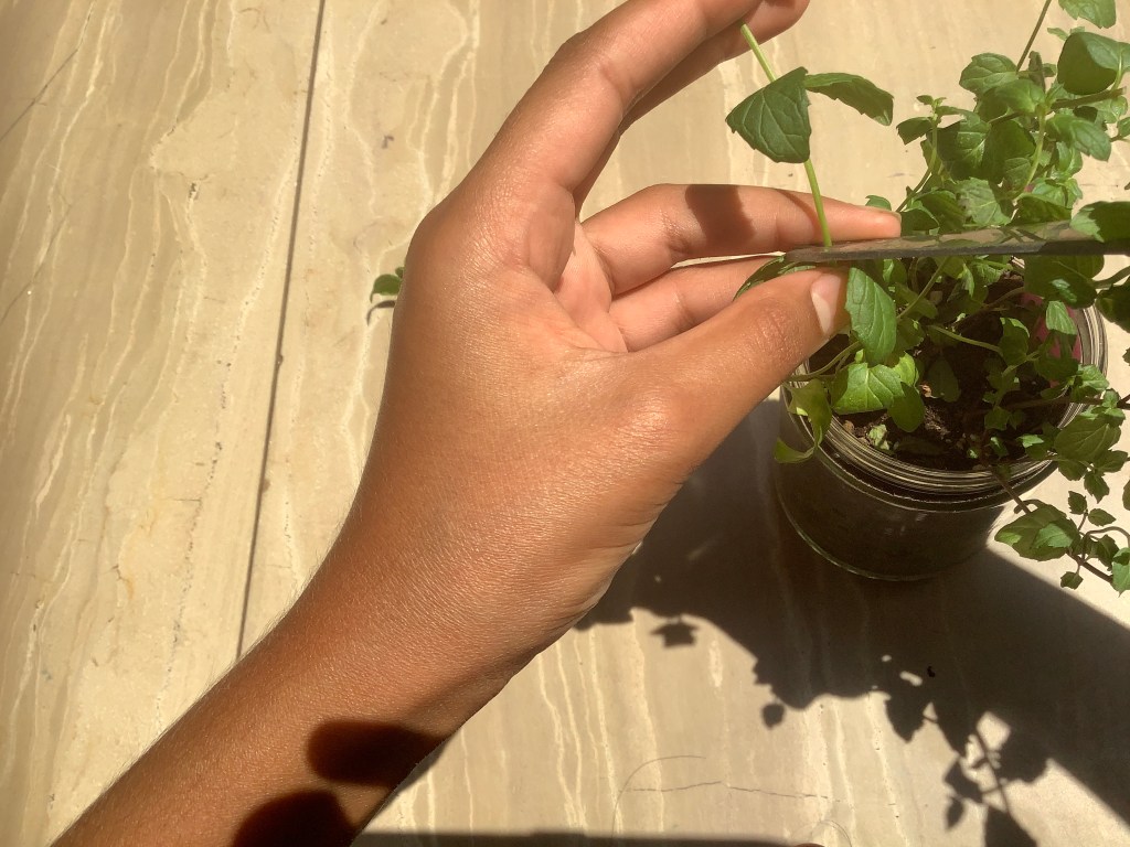 let’s start with our mint! Trimming mint is like trimming basil. You cut the stem at a leaf node so that your plant will get more bushy and put out more new growth. Check out my post about pruning basil here: https://tigershakti.wordpress.com/2020/07/27/how-to-prune-basil/