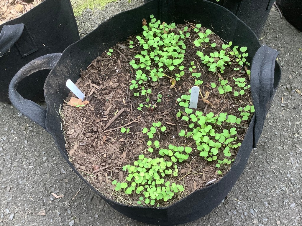 The second crop you can plant are radishes! Radishes are also a super fast growing root crop and you can also eat their leaves in salads. To start the seeds, use your finger to make a trench in the soil that is about a half inch deep. Then, sprinkle the seeds in the trench. Then water!
