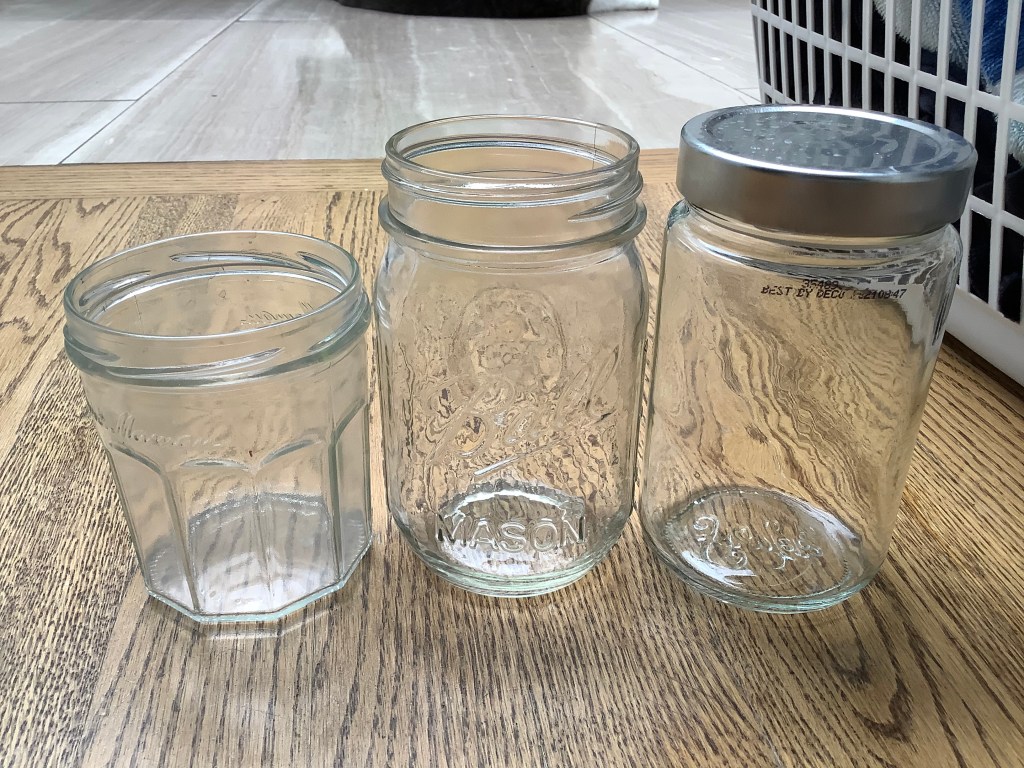 The first step to grow herbs in mason jars it to (obviously) get a mason jar. Your mason jar could be anything from a cleaned jam or salsa jar, to a store bought jar. I like to use recycled jam, salsa, etc. for growing my herbs inside.