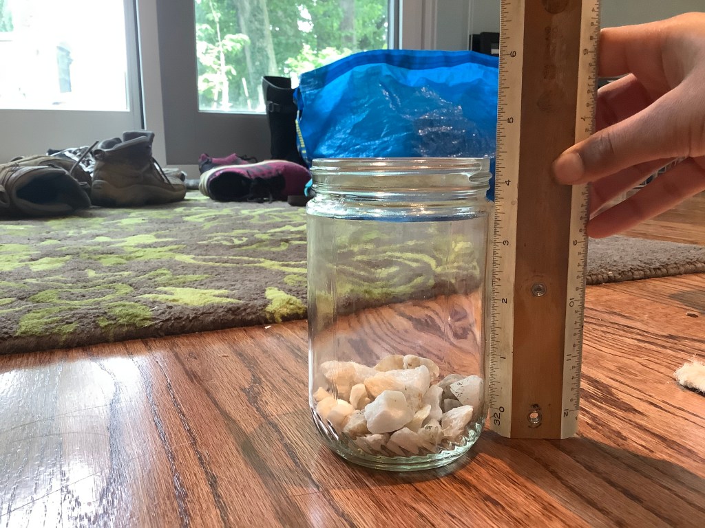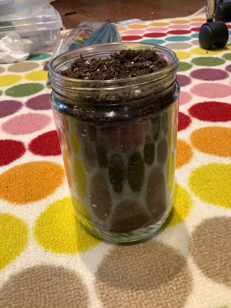 Next, we need some soil and drainage material. The drainage material helps to hold the excess water from the plant‘s soil so the roots do not rot. Drainage material can be rocks, shells, or broken terra-cotta pieces. When you get your soil, it’s important to buy potting mix because if you just get it from outside, it can have bugs, other seeds, and more things you don’t want in your mason jar herb garden. To fill your mason jar, place your drainage material on the bottom to about 1/2 to 1 inch high.