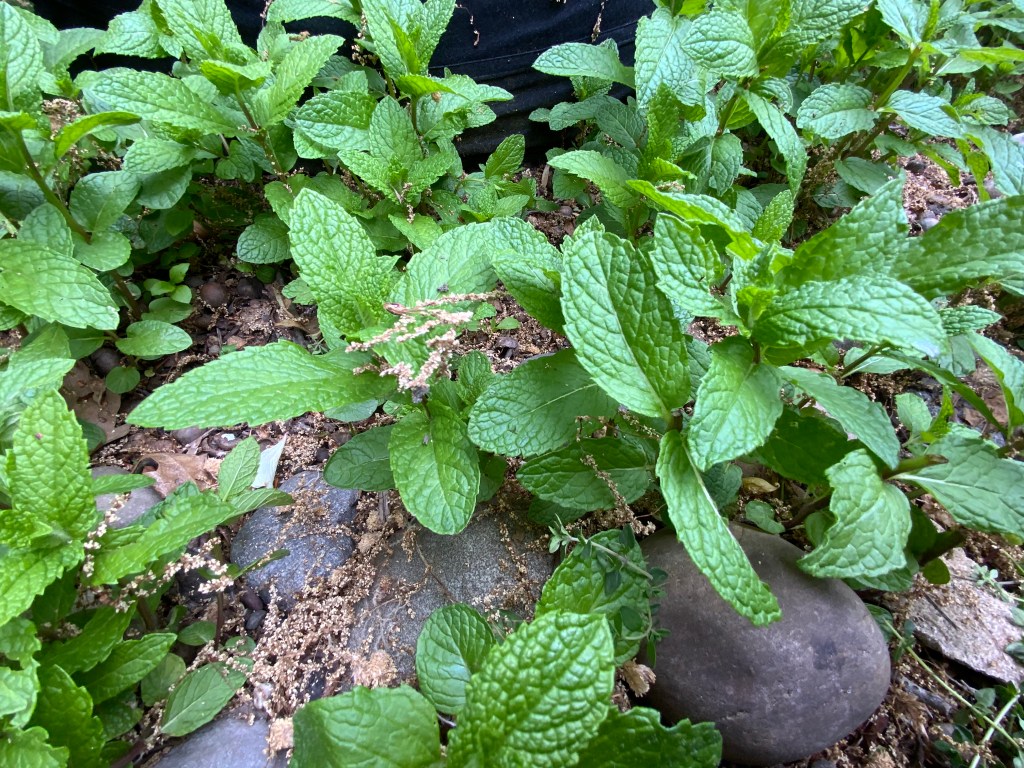 (We have containers for most of our plants here to take care of the problem of bad soil. The soil has been loosened where the mint is in the ground.)